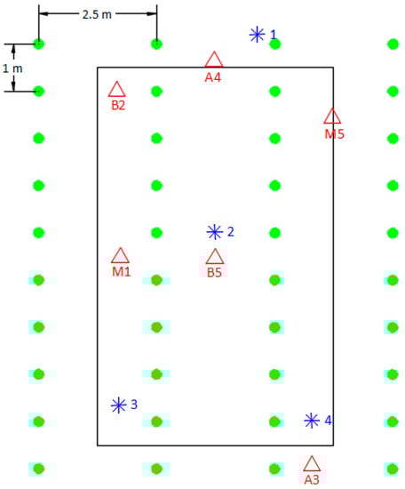 Diagram of TLS data acquired from the FARO Focus3D M70 scanner in one of the study plots. Stools represented by green circles; scan positions represented by blue asterisks; spheres represented by red triangles.