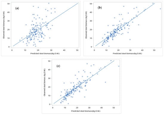 Concordance between observed and predicted values of individual stool biomass for the TLS model (a), Field-inventory model (b), and combined model (c). Straight lines indicate the 1:1.