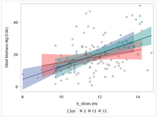 In all three fitted models, the inclusion of plot and/or clone random effects did not lead to an increase in AIC; thus, we omitted these terms from Equation (2). This result points to a non-significant effect of the clone over the relationship between biomass and different metrics. In this regard, Figure 6 shows the individual behavior of each clone in terms of the relationship between w_st and h_slices, revealing non-significant differences between clones.
