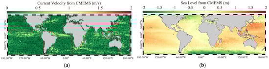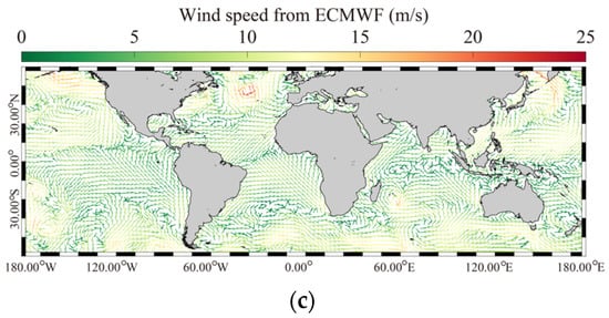 (a) The daily-average Copernicus Marine Environment Monitoring Service (CMEMS) currents map on 1 January 2020; (b) the daily-average CMEMS sea level map on 1 January 2020; and (c) the European Centre for Medium-Range Weather Forecasts (ECMWF) winds map at 00:00 UTC on 1 January 2020. The red lines in (a) are the dividing lines of the Pacific Ocean, Atlantic Ocean, and Indian Ocean.