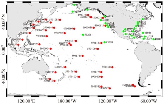 The geographic locations of the National Data Buoy Center (NDBC) buoys and Array for Real-time Geostrophic Oceanography (Argo) buoys in the Pacific Ocean. The green points represent the NDBC buoys and the red points represent the Argo buoys, in which the numbers beside the buoys represent the IDs.