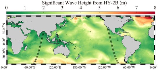 The SWH measurements from the Haiyang-2B (HY-2B) altimeter from 00:00 to 04:00 UTC on 15 January 2020. The background was the SWH simulated from the WW3 model at 00:00 UTC on 15 January 2020.