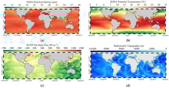 (a) The Simple Ocean Data Assimilation (SODA) practical salinity map; (b) the SODA potential temperature map in January 2015; (c) the National Centers for Environmental Prediction (NCEP) total heat flux; (d) the global bathymetric topography map.