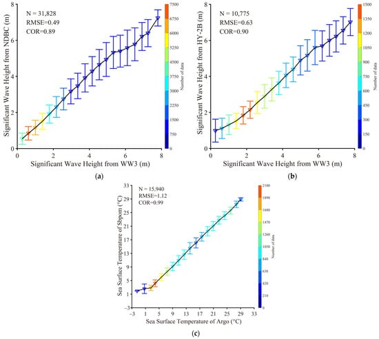 (a) Comparison of the SWHs simulated using the WW3 model with NDBC buoys for a 0.4 m bin. (b) Comparison of the WW3-simulated SWHs with HY-2B measurements for a 0.4 m bin. (c) Comparison of the sea surface temperature simulated using the sbPOM model with Argos for a 1.8 °C bin between −3 °C and 33 °C. Note that the error bars represent the standard deviation of each bin for the matchups.