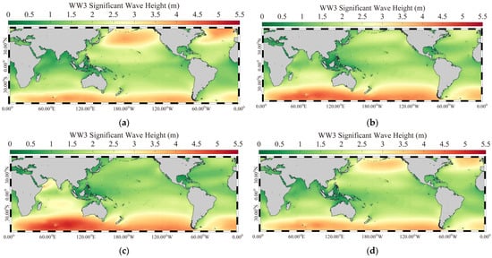 The seasonal-averaged significant wave height (SWH) (m) at the global ocean (60°S–60°N, 180°W–180°E) calculated by the WW3 model. (a) spring; (b) summer; (c) autumn; (d) winter.