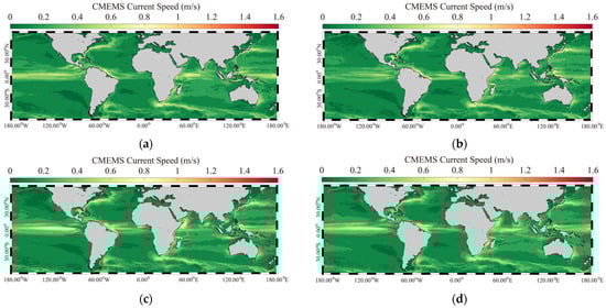 The seasonal-averaged CMEMS current speed (m/s) at the global ocean (60°S–60°N, 180°W–180°E). (a) spring; (b) summer; (c) autumn; (d) winter.
