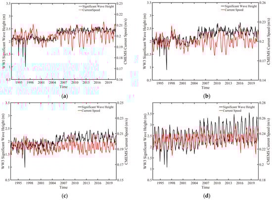 The comparisons of the WW3-simulated SWHs and the CMEMS current speed in the global seas (a) the Pacific Ocean, (b), the Atlantic Ocean, (c) and the Indian Ocean, (d) are shown in Figure 8. The dividing lines of the Pacific Ocean, Atlantic Ocean, and Indian Ocean are shown as red solid lines in Figure 1a. In 1993–2012, the monthly variation trend of the SWHs was gradually increased in the global seas and the three ocean areas. Specifically, as shown in Figure 8d, the oscillations of the SWHs and the current speed were consistent in the Indian Ocean during the past 28 years.