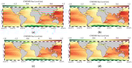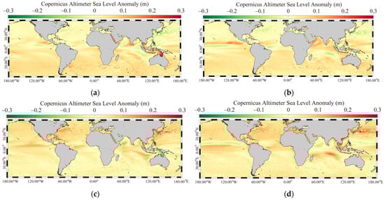 The global seasonal-averaged sea level anomaly from the CMEMS [55] is shown in Figure 10. The sea level anomaly rose in the southern hemisphere and fell in the northern hemisphere in spring and summer. In autumn and winter, the sea level anomaly rose in the northern hemisphere and fell in the southern hemisphere. However, in the equatorial ocean areas, the seasonal variation was the opposite.