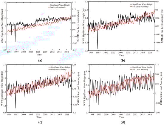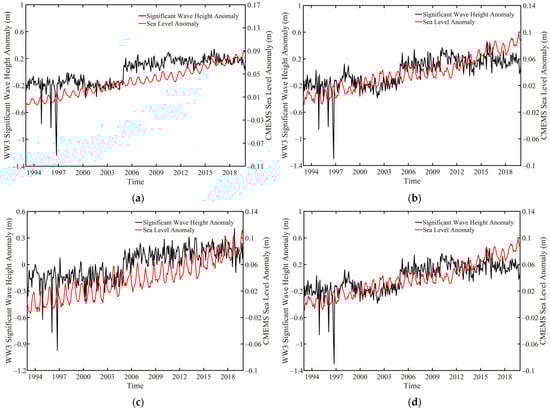Comparing the monthly-averaged WW3-simulated SWHs, the WW3-simulated SWHs anomaly, the CMEMS sea level, the CMEMS sea level anomaly in the global seas, and the Pacific Ocean, Atlantic Ocean, and Indian Ocean during the past 28 years, the relationship among the SWHs, sea surface elevation, and sea level anomaly was analyzed. As shown in Figure 11, Figure 12 and Figure 13, the upward trends of the monthly SWHs, sea level and the sea level anomaly were consistent in 1993–2015 in the three oceans. However, the upward trend of the SWHs slowed down between 2015–2021.
