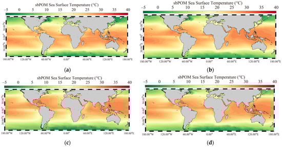 As mentioned in [52], the four terms induced by waves contribute to the ocean circulation; therefore, it is essential to analyze the influence of water temperature on waves. The seasonal-averaged sbPOM SST in 1993–2015 is shown in Figure 14. In general, the SST in the equatorial areas and western boundary of the Pacific Ocean and the Atlantic Ocean was cold, especially in autumn and winter. At the eastern boundary of the Indian Ocean, the low SST appeared in autumn. The SST in the high-latitude areas was cold and became warm in the low-latitude areas. This latitude-distribution is governed by the declination of the sun.
