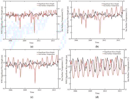 With the rapid melting of the sea ice in the Arctic and Antarctic Oceans [56], the rise of the global sea level has been observed by long-term satellites and moored buoys [57]. Recent studies have focused on the distribution of waves in regional seas and tropical cyclones using numerical models. As concluded in [6], the accuracy of wave simulations by numeric models is improved in tropical cyclones considering the influence of currents. In the background of climate change (i.e., the rise in sea levels), the terms of current and sea level are included in the wave simulations. Moreover, the water temperature of the upper layer is affected by waves. Therefore, this work studied the variation of the global wave distribution and its effect on SST in the background of climate change.