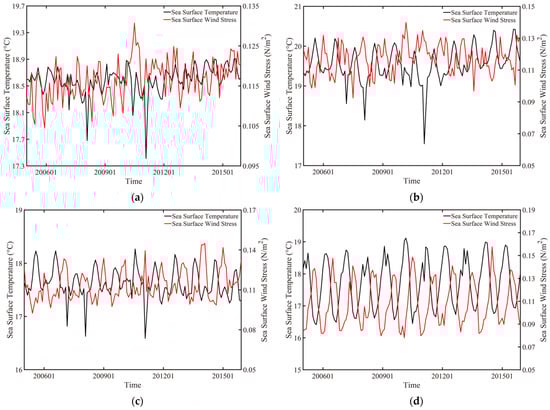 The relationship between monthly-averaged sbPOM sea surface temperature and sea surface wind stress. (a) The global ocean; (b) the Pacific Ocean; (c) the Atlantic Ocean, and (d) the Indian Ocean. The red and black solid lines represent the sea surface wind stress and the sea surface temperature, respectively.