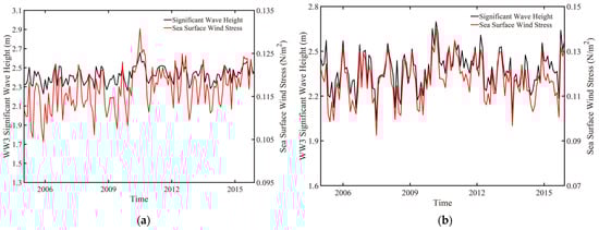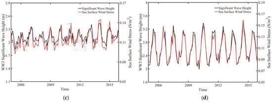 To analyze the relationship between the monthly-averaged SWHs and SST, the comparisons of the WW3-simulated SWHs and the sbPOM-simulated SST in the global ocean, the Pacific Ocean, the Atlantic Ocean, and the Indian Ocean are shown in Figure 15. During the past 10 years, the SST oscillation had a passive response to the SWHs in the three oceans that revealed a strong correlation between the SST and SWHs. In addition, the globally monthly-averaged SST increased from 2012, while the SWHs presented a trend that was similar to that of the Pacific Ocean, as illustrated in Figure 15b. Otherwise, the ocean waves were driven by winds. In order to analyze the influence of winds on SWHs and SST, the monthly-averaged sea surface wind stress was compared to the SST and SWHs, as illustrated in Figure 16 and Figure 17, respectively. The sea surface wind stress (τ) calculation equation is: