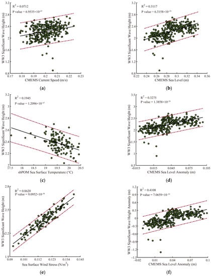 The linear regression analysis of the WW3-simulated SWH and (a) currents from CMEMS, (b) sea level from CMEMS, (c) sbPOM-simulated sea surface temperature, (d) CMEMS sea level anomaly, and (e) sea surface wind stress in the Pacific Ocean. The linear regression analysis of the WW3-simulated SWH anomaly and CMEMS sea level anomaly (f) in the Pacific Ocean. The black solid line represents the linear fitted line. The two red dotted lines represent the 95% prediction intervals.