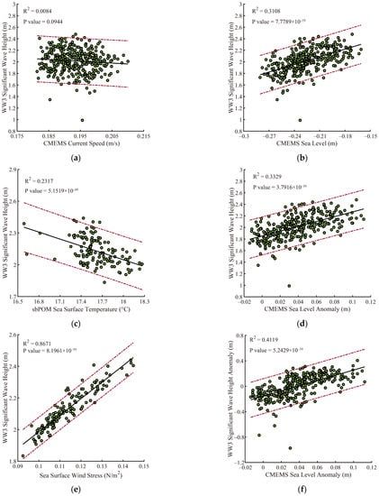The linear regression analysis of WW3-simulated SWH and (a) currents from CMEMS, (b) sea level from CMEMS, (c) sbPOM-simulated sea surface temperature, (d) the CMEMS sea level anomaly, and (e) the sea surface wind stress in the Indian Ocean. The linear regression analysis of WW3-simulated SWH anomaly and CMEMS sea level anomaly (f) in the Indian Ocean. The black solid line represents the linear fitted line. The two red dotted lines represent the 95% prediction intervals.