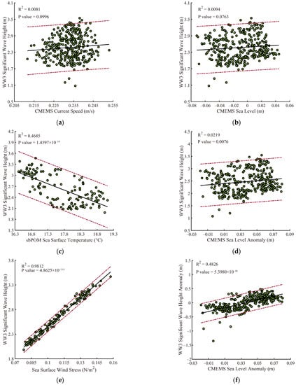 The linear regression analysis of WW3-simulated SWH and (a) currents from CMEMS, (b) sea level from CMEMS, (c) sbPOM-simulated sea surface temperature, (d) CMEMS sea level anomaly, and (e) sea surface wind stress in the Atlantic Ocean. The linear regression analysis of the WW3-simulated SWH anomaly and the CMEMS sea level anomaly (f) in the Atlantic Ocean. The black solid line represents the linear fitted line. The two red dotted lines represent the 95% prediction intervals.