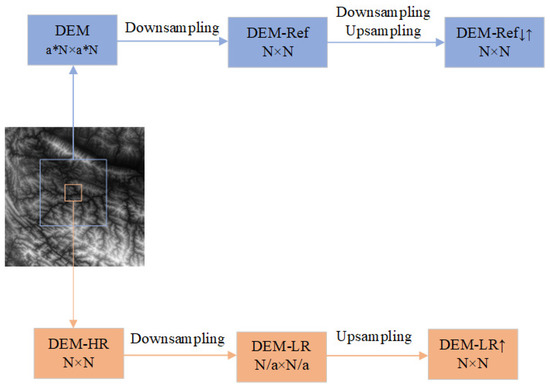 Data preprocessing flow. DEM-HR refers to the high-resolution DEM data used for comparison with SR data. DEM-LR refers to the low-resolution DEM data obtained after downsampling DEM-HR as input. DEM-Ref refers to the reference data obtained using self-similarity. DEM-LR↑ refers to the data obtained by upsampling DEM-LR, while DEM-Ref↓↑ refers to the data obtained by downsampling and upsampling the reference data. We will use DEM-LR↑ and DEM-Ref↓↑ to calculate the correlation between the low-resolution image and the reference image.