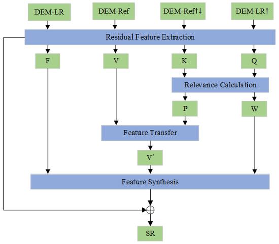 Figure 2 shows the data preprocessing process. First, the original high-resolution DEM is cropped to obtain an N × N sized DEM-HR image. This image is used as the ground truth for comparison with the DEM-SR results. Then, we apply bicubic downsampling with a factor of a× on DEM-HR to obtain DEM-LR, which is used as the super-resolution input image. Unlike the traditional reference-based SR method that uses high-resolution images as reference images, there is no available reference terrain dataset, and constructing the dataset is a huge workload. Considering the self-similarity of the terrain, we use large-scale DEM images centered on DEM-LR as reference images and apply them to super-resolution reconstruction. With DEM-HR as the center, we crop the original high-resolution DEM to obtain a DEM image of size a*N × a*N and then apply bicubic downsampling with the factor a× on the a*N × a*N DEM image to obtain DEM-Ref, which is used as the reference image of DEM-LR. Then we apply bicubic upsampling with the factor a× on DEM-LR to obtain a DEM-LR↑ image and we sequentially downsample and upsample the DEM-Ref with the same factors a× to obtain DEM-Ref↓↑. The correlation between the LR and the reference could be calculated via the use of the DEM-LR↑ and DEM-Ref↓↑. Finally, our model generates a synthetic feature map from the inputs of DEM-LR, DEM-Ref, DEM-LR↑, and DEM-Ref↓↑, and uses it to produce HR predictions.
