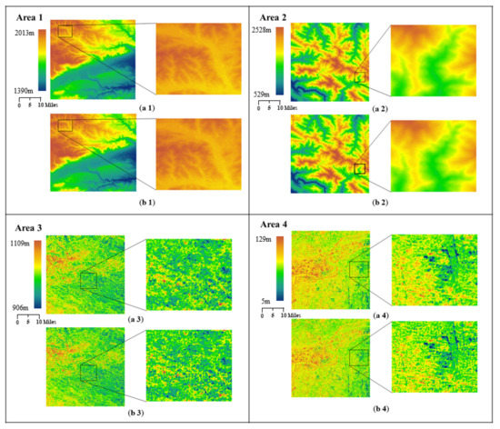 where denotes the values of the terrain parameters generated with the original high-resolution DEM and denotes the values of the terrain parameters generated with the reconstructed high-resolution DEM.