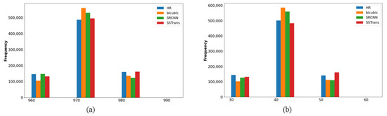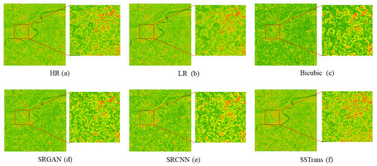 A comparative analysis using bicubic interpolation, SRGAN, and SRCNN was performed to confirm the superiority of the models. The comparison of different methods is shown in Table 3 and Figure 6.