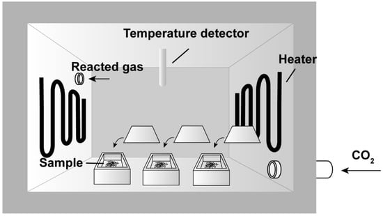 Experimental settings of the CO2 oxidation experiments. The furnace is heated with a temperature detector, monitoring temperature and facilitating constant high-temperature conditions. During the experiments, high-purity CO2 gas flows into the furnace at a rate of 0.5 L/min, and the pressure inside the furnace is maintained at 1 bar. Reacted gas is then out-flowed to the furnace from the outlet. The olivine powders are placed in corundum crucibles inside the furnace.
