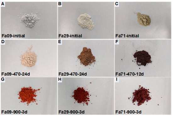 The oxidation products of olivine showed different colors depending on the initial Fa# values, oxidation temperature and oxidation duration (Figure 2). At 470 °C, the final products of olivine Fa09, Fa29 and Fa71 after oxidation were light yellow, brown and dark brown, respectively (Figure 2D–F). At 900 °C, the final products of olivine Fa09, Fa29 and Fa71 showed substantial color changes—to red tones overall, varying from red to dark red with increasing Fa# values (Figure 2G–I).