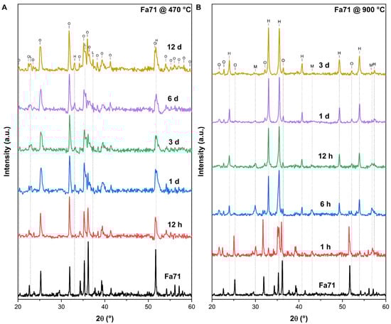 XRD patterns of the initial Fa71 and its final oxidation products at 470 °C and 900 °C. (A) Under 470 °C. (B) Under 900 °C. O = olivine; H = hematite; M = magnetite; L = laihunite.