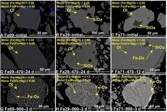 SEM-EDS analysis of the initial and final oxidized samples. (A–C) The initial olivine of Fa09, Fa29 and Fa71, respectively. (D–F) The final products of Fa09 through Fa71, oxidized at 470 °C for the longest oxidation times (24 days for Fa09 and Fa29; 12 days for Fa71). (G–I) The final products of Fa09 through Fa71, oxidized at 900 °C for the longest oxidation times (3 days). Excess SiO2 is induced via the synthesis processes and found in the interior of synthetic Fa29 and Fa71. After oxidation at 470 °C, Fa09 (D) and Fa29 (E) show no substantial differences in morphology from their initial states, and Fa71 (F) produces Fe-oxides along the interior cracks within the olivine particles. After oxidation at 900 °C, Fe oxides are ubiquitously formed in all three types of olivine on the rim of olivine and along the dislocations and cracks in the interior of olivine. The altered olivine shows various morphologies depending on different Fa# values, with Fa09 (G) in the form of spots and Fa29 (H) and Fa71 (I) in gridded patterns. Ol = Olivine; Fe-Ox = Fe Oxide.