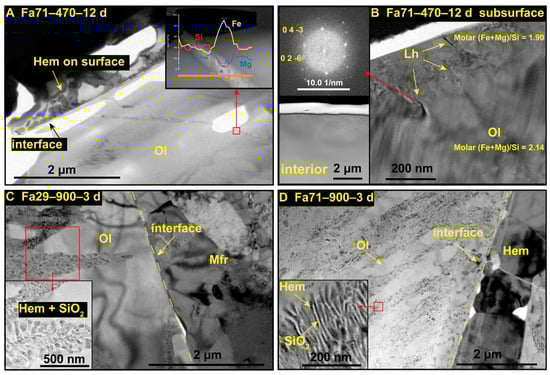 At 470 °C, there were no obvious secondary phases or morphological changes found by SEM in the final products of Fa09 (Fa09–470–24 d) or Fa29 (Fa29–470–24 d), as compared to their initial states (Figure 4A,B,D,F). In Fa71, the molar fraction of Fe in the altered olivine was decreased, and Fe oxides formed along the cracks inside the olivine particles (Figure 4C,F). We chose samples of Fa71–470–12 d, Fa29–900–3 d and Fa71–900–3 d to perform further TEM analysis (Figure A6). During preparation of the FIB foil of sample Fa71–470–12 d, the ion beam probe shifted due to the presence of magnetic materials within the sample, consistent with the detection of maghemite, magnetite or laihunite. TEM analysis of Fa71–470–12 d found that hematite was formed on the grain surface (Figure 5A), while laihunite was produced in the relative interior layer beneath the hematite layer (Figure 5B). Additionally, Fe oxides were present on the cracks (Figure 5A). Disordered folds formed in the altered olivine close to the grain rim, and the (Fe+Mg)/Si molar ratio was slightly lower than that of primitive olivine. Electron diffraction patterns of TEM of those disordered folds suggested an olivine-type structure, such as altered olivine or laihunite (Figure 5B).
