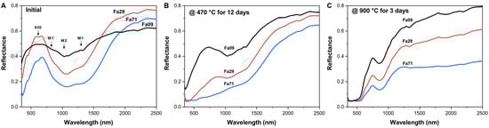 Comparison of visible and near-infrared spectra (VINR) of initial olivine (Fa09, Fa29 and Fa71) and their oxidation products. (A) Initial olivine of Fa09, Fa29 and Fa71. The arrows point to the diagnostic absorption center of initial olivine, in which the M2 position shifts toward longer wavelengths with increasing Fa# values. The band depth of the diagnostic absorption also gradually deepens with increasing Fa# values in the initial olivine. (B) Spectral comparisons of the oxidation products of Fa09, Fa29 and Fa71 at 470 °C for 12 days. (C) Spectral comparisons of the oxidation products of Fa09, Fa29 and Fa71 at 900 °C for 3 days. The alterations in the reflectance of Fa09, Fa29 and Fa71 under oxidizing conditions show gradual changes, consistent with those of the initial olivine.