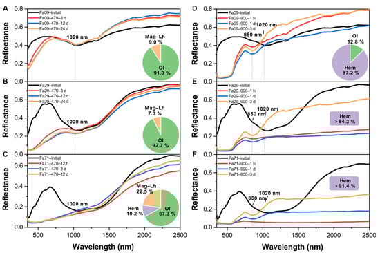At 900 °C, due to substantial phase changes in the oxidized products, from olivine to hematite, the reflectance of the oxidized samples was altered accordingly, demonstrating the absence of olivine diagnostic absorption bands at 1020 nm and the occurrence of hematite diagnostic absorption at 850 nm (Figure 7D–F). The band depth of 850 nm, representing hematite, increased with increasing oxidation duration. Considering the influence of the initial Fa# values of olivine, the hematite diagnostic absorption band appeared earlier in Fa09 and relatively late in Fa71.