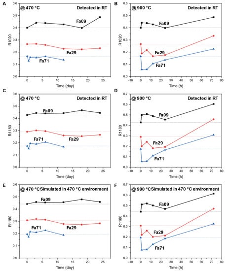 Variations in R1020 and R1180 for Fa09, Fa29 and Fa71 with increasing oxidation time. (A) and (B) are the measured R1020 of three olivine samples oxidized at 470 °C and 900 °C, respectively. (C) and (D) are the measured R1180 of three olivine samples oxidized at 470 °C and 900 °C, respectively. (E,F) are the simulated R1180 of samples—the same as those presented in (C,D)—considering the influence of thermal radiance at 470 °C, within which the spectral measurements are conducted. The dashed lines represent the spectral parameters of initial olivine. The final products of Fa09, being oxidized at 470 °C or 900 °C, produce consistently higher R1020 and R1180 values than those of the initial Fe09. Final products of Fa29, being oxidized at 470 °C, show decreasing trends of R1020 and R1180 compared to the initial Fa29. After oxidation at 900 °C, the R1020 and R1180 of the Fa29 products first decrease to lower than the initial Fa29 and then reverse to increase; the final R1020 and R1180 are substantially higher than those of the initial Fa29. The final products of Fa71 at 470 °C show a decreasing trend of R1020 and a generally increasing trend of R1180. Being oxidized at 900 °C, the variation trend is similar to that of Fa29. Simulated spectral parameters, considering high environmental temperature in the spectral measurements, show similar patterns to the measured spectral parameters. RT = room temperature.