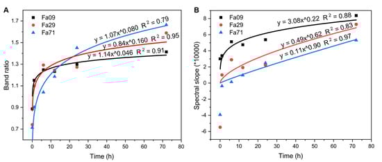 Spectral parameters of the R1020/R850 band ratio and spectral slopes of (R1020-R850)/(1020-850), with increasing oxidation durations, for Fa09, Fa29 and Fa71 at 900 °C. (A) Correlation between the band ratio of R1020/R850 and the oxidation duration. (B) Correlation between the spectral slope and the oxidation duration. Spectral slopes are calculated using the formula (R1020-R850)/(1020-850). These two spectral parameters correlate well with the oxidation duration and can be used to characterize the extent of olivine weathering.