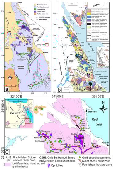 (a) The Nubian Shield of northern Sudan and Egypt modified from []. The locations of the Gerf ophiolite complex, N–S Hamisana Zone, and Oko Shear Zone are shown. Also shown are the major suture zones, the Allaqi–Heiani, Onib–Sol Hamed, Naskasib and Keraf suture zone of []. The extent of the Najd Fault Zone in the CED and SED is also shown, Inset shows a location map of the study area (b) Simplified geologic map of the Eastern Desert, Egypt, (c) Distribution of the known gold mining sites and gold quartz vein occurrences relative to the major fault/shear structures and ophiolitic masses in the South Eastern Desert terrane modified after []. The inset is the map of Egypt showing the location of (c).
