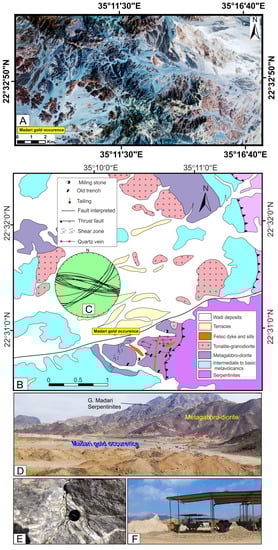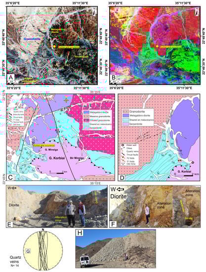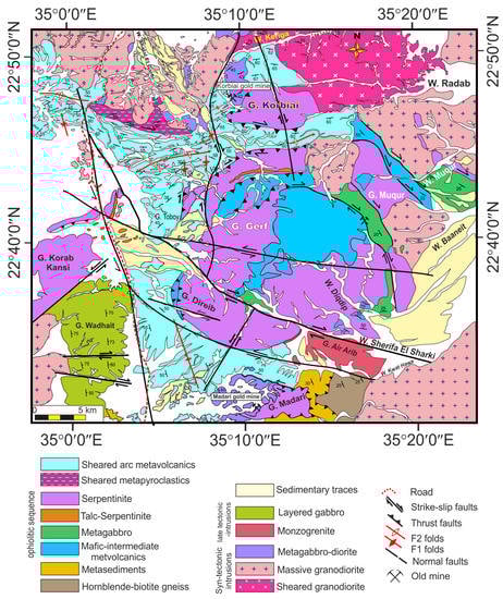 The southern sector of the SED, particularly where the study area lies is characterized by numbers of suture zones that are decorated with abundant ophiolites (e.g., Allaqi-Heiani-Onib-Sol Hamed-Yanbu suture and Hamisana shear zone) []. Many of the gold deposits are found as gold exposures inside the quartz-mineralized shear zones that occur between and within the Neoproterozoic basement rocks (e.g., ophiolitic sequences, island arc assemblages, Hammamat and Dokhan rocks, and post-orogenic granitoids) [,].