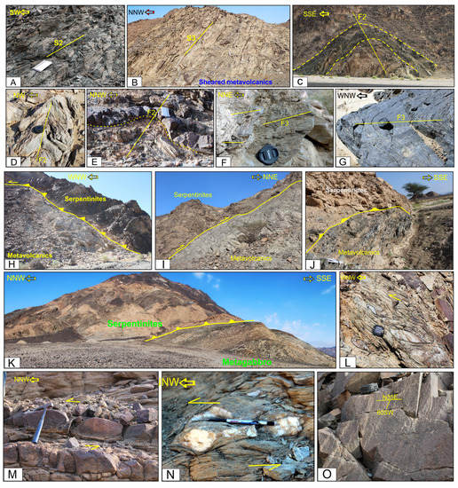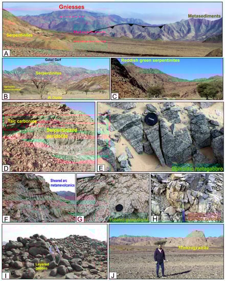 (A) A sequence of quartzo-feldspathic gneiss striking N-S juxtaposed with metasediments, (B) The greyish green serpentinites of G. Gerf thrust over the ophiolitic metavolcanics (C) Reddish green serpentinites along W. Diqdip, (D) Small massive masses of the serpentinized peridotite enclosed within the calcite-magnesite rocks of G. Korab Kansi, (E) Sheared pod of ophiolitic metagabbro, (F) Sheared arc metavolcanics from W. Keriga, (G) The foliated granodiorite to the north of G. Korabi, (H) The steeply dipping layered gabbro to the south of G. Korab Kansi, (I) Layered gabbro to the south of G. Korab Kansi, (J) The late-tectonic low relief monzogranites to alkali feldspar granites intrude the serpentinites along W. Sherifa.