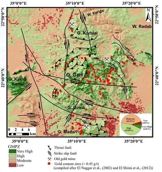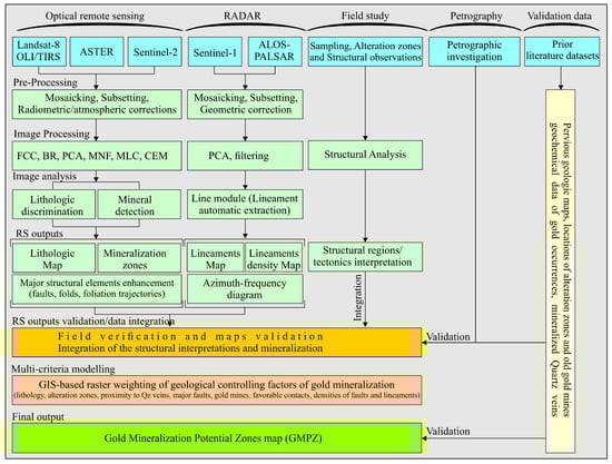 Remote sensing data and its modern technologies are used now to distinguish the various lithological units and establish the geological structure connected to huge shear belts, in particular the vast and complex terrains, to produce a detailed structural geologic map. The multisensor satellite imagery can be used to detect the alteration zones which allow to track and identify different minerals (e.g., carbonate, iron oxides minerals and clay minerals). Therefore, remote sensing data are considered to be a helpful and cost-effective exploration technique for finding orogenic gold mineralization in hazardous locations all over the world [,,].