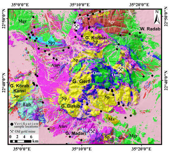 - Hassan, S.; Sadek, M. Geological mapping and spectral based classification of basement rocks using remote sensing data analysis: The Korbiai-Gerf nappe complex, South Eastern Desert. Egypt. J. Asian Earth Sci. 2017, 134, 404–418. [Google Scholar] [CrossRef]