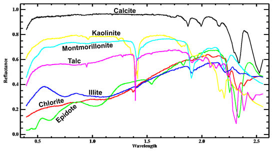 The hydrothermal alteration zones can be identified by the diagnostic spectral signatures for OH-bearing, clay, iron oxides, carbonate, and sulfate minerals in the visible, near infrared, and shortwave infrared wave lengths regions []. These minerals give certain absorption features in the visible near infrared region (VNIR, 0.4 to 1.1 µm) due to the electronic processes resulting from the transitional elements in the minerals containing Fe2+, Fe3+, Mn, Cr, Co and Ni elements []. The hydrous mineral or OH-bearing minerals (Mg-O-H, Al-O-H, Si-O-H) and CO3 acid group have specific absorption features in the shortwave infrared region (SWIR) (2.0–2.50 µm) [].