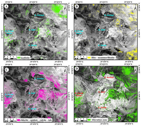 The constrained energy minimization (CEM) approach is considered as a spectral mapping technique as proposed by Harsanyi et al. []. By suppressing the response of all other features and treating them as the unknown background, it aims to maximize the spectrum response of a target. It depends on the remotely sensed data surface reflectance and the reference spectra of the target alteration zone minerals acquired from the spectral analysis or spectral library. It has become one of the best mineral mapping techniques and most used for minerals abundance mapping []. The current study used CEM to distinguish seven alteration minerals which represent three alteration zones of argillic (kaolinite) Phyllic (illite, montmorillonite,) and propylitic (chlorite, epidote, calcite, talc) from the ASTER VNIR-SWIR surface reflectance data. These three alteration zones are favorable zones to the gold mineralization.