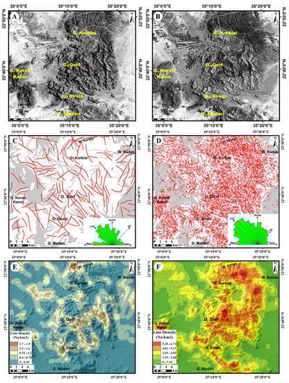 Lineaments extraction (A) PC1 of PALSAR, (B) PC1 of Sentinel-1B, (C) Lineaments map from PALSAR, (D) Lineaments map from S1B, and (E,F) Lineaments density map of PALSAR and S1B, respectively.