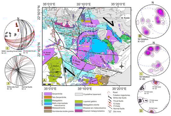 The Egyptian Eastern Desert (EED) has been divided into three main tectonic sectors, these are the Northern Eastern Desert (NED), Central Eastern Desert (CED), and Southern Eastern Desert (SED) [,]. By focusing on the SED where the study area is located, the SED has similar rock units to the CED which are dominated by gneisses, migmatites, ophiolitic succession, granitoids and island arc assemblages (e.g., volcanogenic metasediments and metavolcanics). On the other hand, the SED has a higher proportion of gneisses [] than the CED, as well as ophiolitic meta-ultramafites that are exposed tectonically as emplaced nappes. While fold-related faults generally associated with pull-apart basins related to the Najd Fault System predominate in the CED, fold-thrust belts in the SED are first-order kinematics that were later overprinted by regional-scale transpression [,,,,,,]. Compared to the CED, the SED appears to represent a deeper amount of exposure and is less impacted by the Najd shearing [].