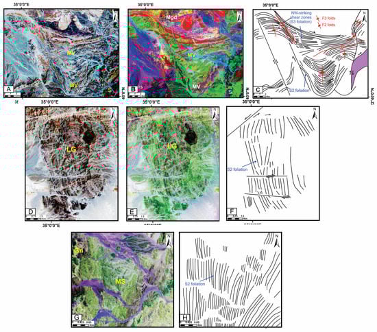 Hassan and Sadek [] used PCA-452 for Landsat-8 and PCA-265 for ASTER data to classify and map the basement rocks in the Gerf area. The PCA-432 in RGB for the Landsat-8 data are produced and shown in Figure 5F. This image successfully delineated the rock units and enhanced the foliated regions. The rock units are characterized by significant colors, where the ophiolitic serpentinite exhibits deep blue to cyan colors, ophiolitic metavolcanics have bright green, and ophiolitic metagabbros take the greenish yellow. The foliated arc metavolcanics have alternative cyan and reddish green tones extended west-east direction and the granitic masses are characterized by fantastic color shades of yellowish green to cyanic in the background of the image.