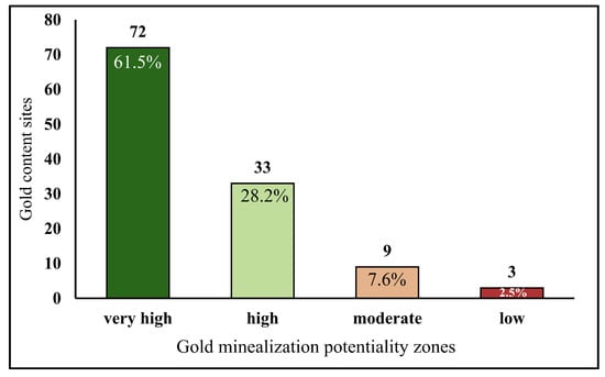 Advanced argillic and/or Argillic alteration zone is recognized by the existence of kaolinite and alunite minerals. Kaolinite mineral index (KLI) was utilized to extract the kaolinite rich pixels (Figure 8C). Whereas the alunite mineral index (ALI) was performed to detect alunite altered mineral (Figure 8D). The detected kaolinite and alunite have a surface abundance on the contacts of ophiolite assemblage and show concentration on the granitic masses and their drainage and superficial deposits. The propylitic alteration zone is characterized by the existence of calcite that was identified using calcite mineral index (CLI) (Figure 8E). The obvious areas of calcite were indicated as cyan color. The dispersal of calcite is almost concentrated over or around the periphery of serpentinite masses and on the contact between the serpentinite and metavolcanics and metagabbros. The calcite represents the ophio-carbonate rocks that were produced due to the metasomatism of the serpentinite. The areas of the carbonates are confined to the estimated gold contents in G. Gerf and G. Korbiai. The argillic alteration zone in the study area was delineated by applying the ASTER band ratio of (4 + 6/5) (Figure 8F). It is illustrated by blue pixels, which overspread G. Gerf, G. Korbiai, G. Korab Kansi, and G. Madari. The distribution of the gold contents in these areas is matched with the areal distribution of the argillic alteration zone which covers more than 147 km2 in the study area.