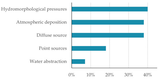 In this work, we analyzed relevant EU documentation and reports [1,12,22,23,24] in order to shape a better understanding of the current situation and the progress of the WFD implementation. Therefore, around 40% of surface waters (rivers, lakes, transitional, and coastal waters) are in good or potential good ecological status while only 38% of them are in good chemical status (i.e., not polluted). Analyzing the 1st RBMPs to the 2nd cycle, we observed that a small percentage of their status had changed. The main significant pressures on surface water bodies are presented in Figure 3. Considering the diffuse sources, we can notice that the main pressure comes from agriculture, while for atmospheric deposition, it comes particularly from mercury.