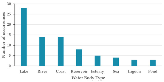 The overall trend of the researchers appeared in the study of the lake environment with 40% of the total 71 studies, while river and coastal zones followed in the ranking with 20% for each (Figure 6). Reservoirs, estuaries, sea, lagoons, and ponds were found to be studied by the researchers but with significantly lower percentages than the three aforementioned water systems.