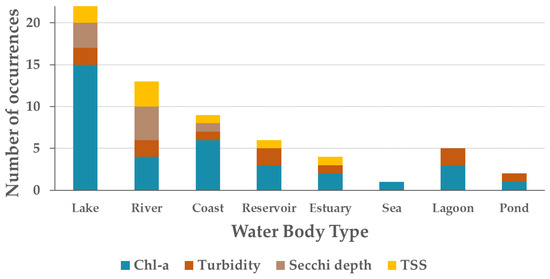 Figure 7 provides an illustration of the distribution of the four predominant indicators (Chl-a, Turbidity, Secchi depth, TSS) per water body type, as resulted from Figure 5. Only Chl-a has been studied in all water bodies while the same results come for turbidity excluding only the sea environment. In contrast, the Secchi depth and TSS indicators were studied mostly in lake and river water bodies.