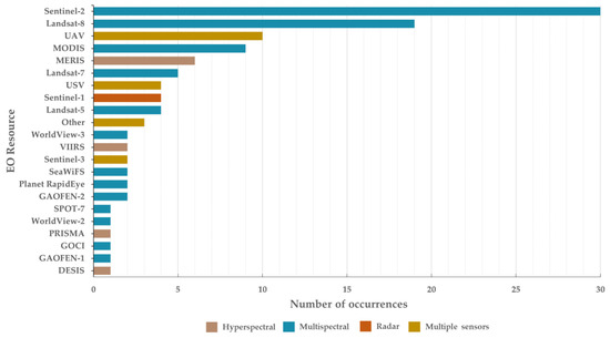 Number of EO resources mentioned in the studies under examination. Other includes two works related to airborne flights and one with in situ spectra fixed platform.