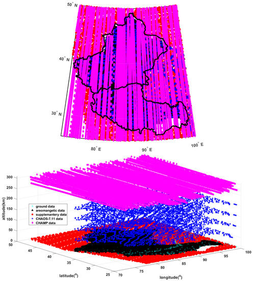 The aeromagnetic measuring data are also adopted. These data come from China’s Aero Geophysical Survey and Remote Sensing Center for Natural Resource between 1970 and 2011. The aeromagnetic modeling data are scalar data grids at a 1 km altitude, including 97,994 valid values covering 979.6 km2 [38]. These data are the magnetic data with the best consistency in China. The corresponding distribution of the lithospheric field with the resolution of 10 km × 10 km is perfect for investigating the national magnetic field. At most, 12,511 aeromagnetic points are adopted in this study.