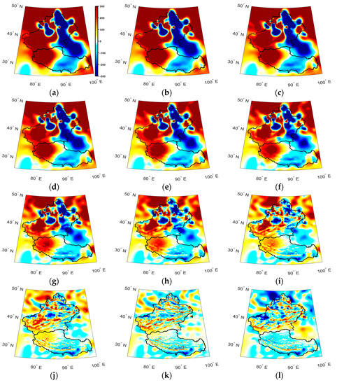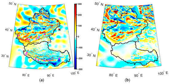 After careful comparison, there are some differences between the two models, especially in the western part of Tibet, which shows a small negative area of the ground data model. In contrast, there is only a positive part of the 3DSS model; part of the reason is that the points in the Qinghai−Tibet Plateau are around 4 km. Hence, the exact distribution is negative and different from the distribution at 0 km by the 3DSS model. However, the total distributions of the two figures are similar, particularly in the negative part that crosses Xinjiang and Tibet and the positive part in the western parts of Xinjiang. Thus, this comparison shows that the new model is reliable.